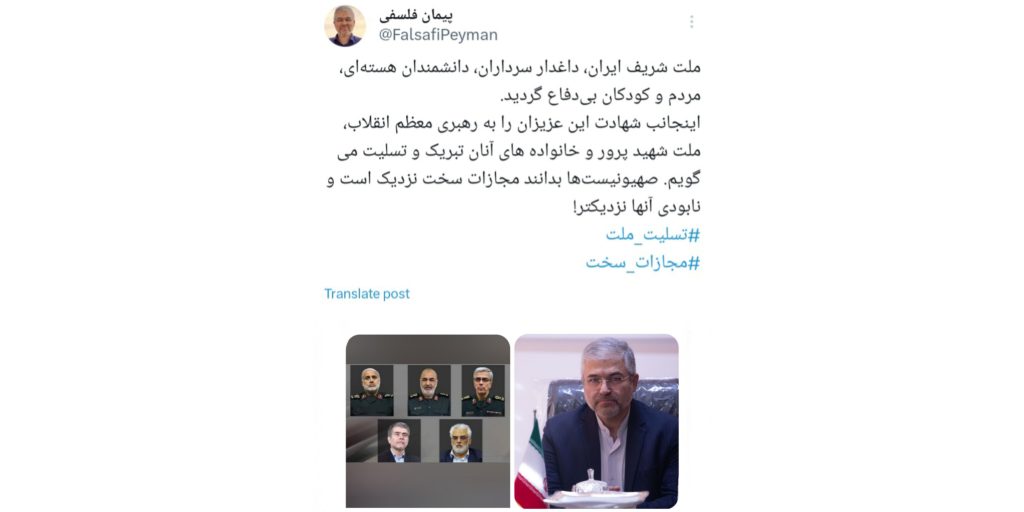 ملت شریف ایران، داغدار سرداران، دانشمندان هستهای، مردم و کودکان بیدفاع گردید. اینجانب شهادت این عزیزان را به رهبری معظم انقلاب، ملت شهید پرور و خانواده های آنان تبریک و تسلیت می گویم. صهیونیستها بدانند مجازات سخت نزدیک است و نابودی آنها نزدیکتر!