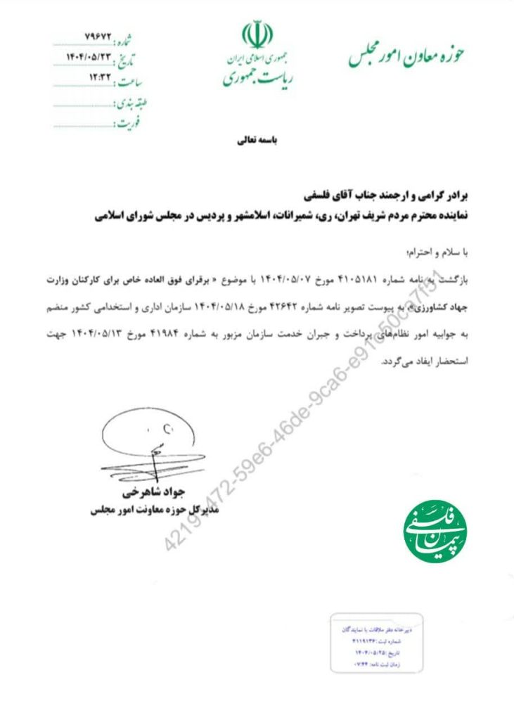 در پی پیگیریهای مستمر “دکتر پیمان فلسفی”، نماینده تهران و رئیس فراکسیون کشاورزی پویا و امور عشایر مجلس، جوابیه رسمی معاونت امور مجلس رئیسجمهور، مورخ ۱۴۰۴/۰۵/۲۳، حاکی از این است که ابلاغ رسمی این دستورالعمل به دستگاههای اجرایی مربوطه، در مسیر تصویب هیئت دولت قرار دارد.