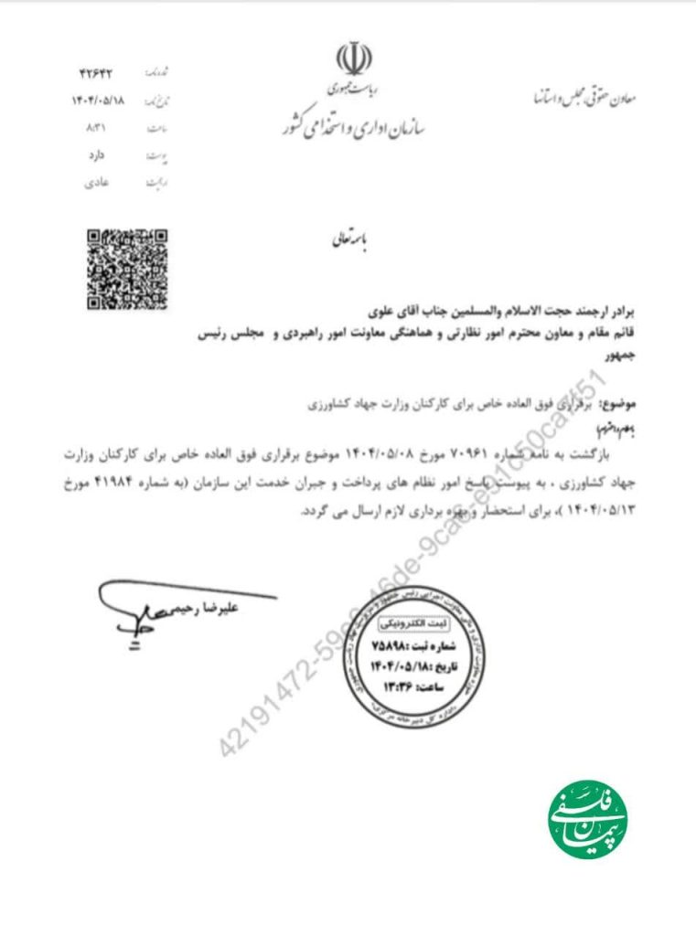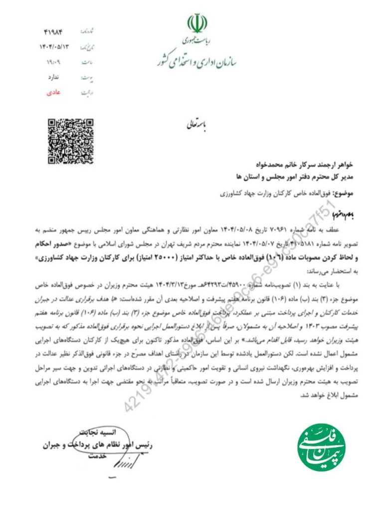آخرین وضعیت فوقالعاده خاص ۲۵۰۰۰ امتیازی کارکنان جهاد کشاورزی؛ در مسیر تصویب هیئت دولت