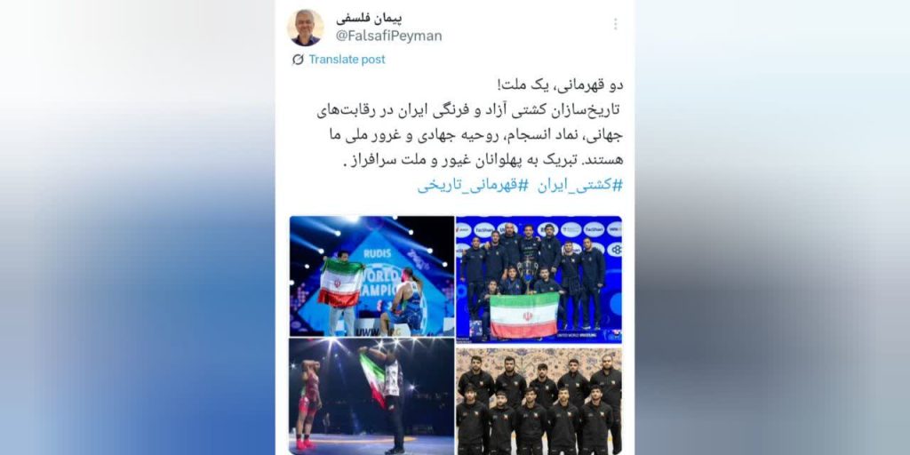 دکتر پیمان فلسفی، نماینده مردم و سخنگوی مجمع نمایندگان استان تهران در پی قهرمانی همزمان تیم های ملی کشتی آزاد و کشتی فرنگی کشورمان، در شبکه های اجتماعی توییتر و ویراستی نوشت: