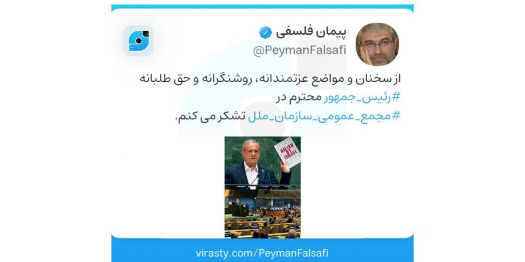 پیمان فلسفی، نماینده مردم و سخنگوی مجمع نمایندگان استان تهران در پی سخنرانی مسعود پزشکیان در مجمع عمومی سازمان ملل، در صفحه شبکه اجتماعی ویراستی خود نوشت: