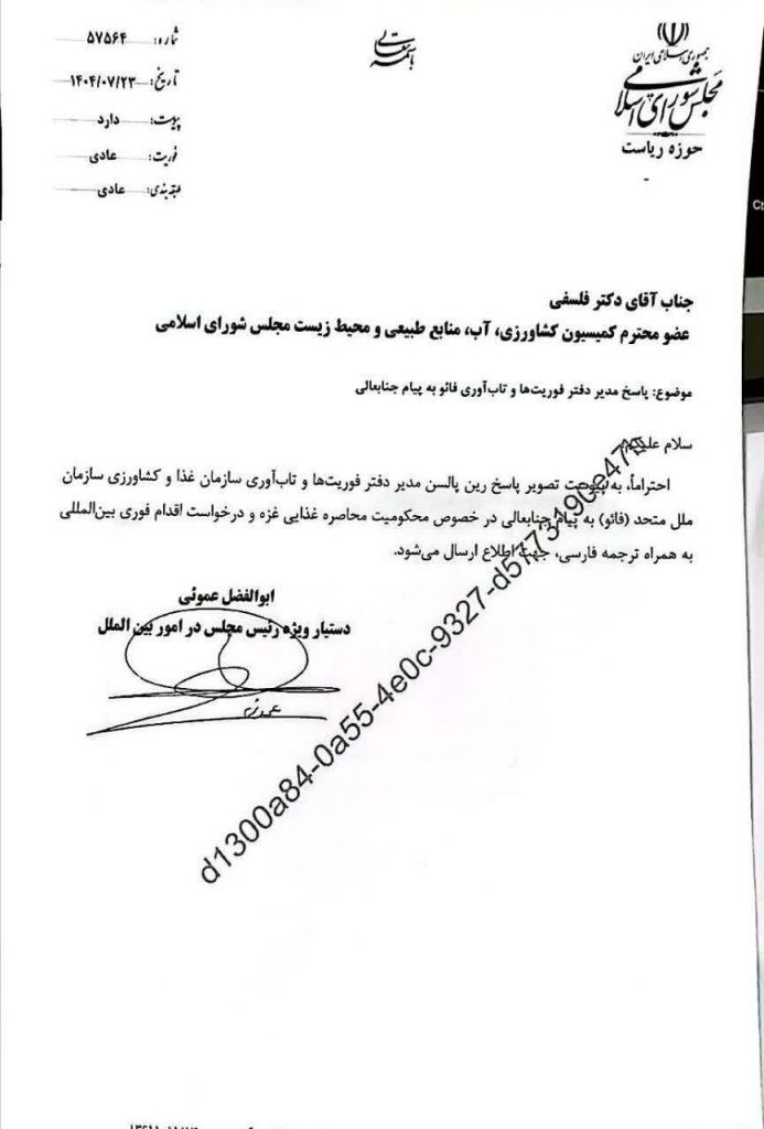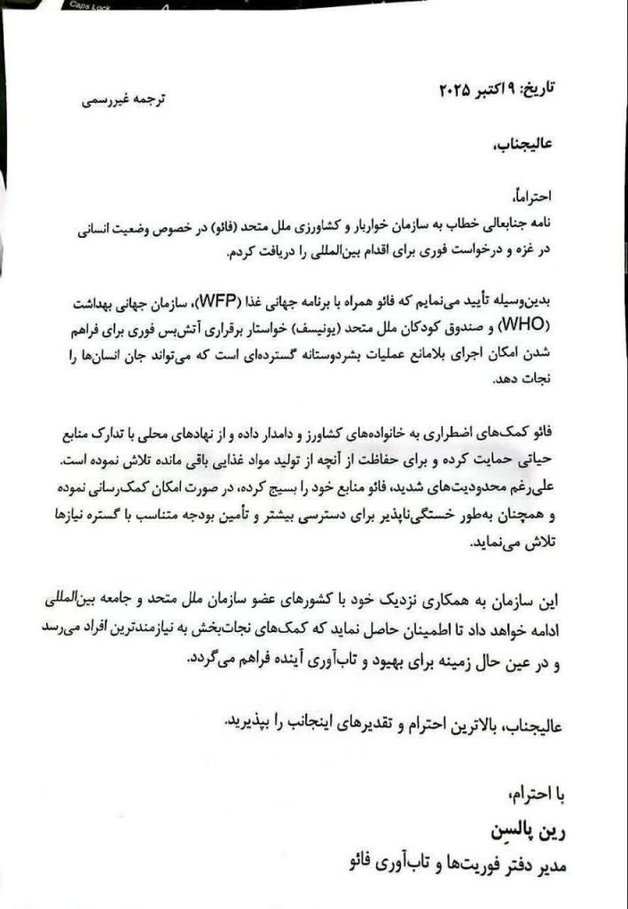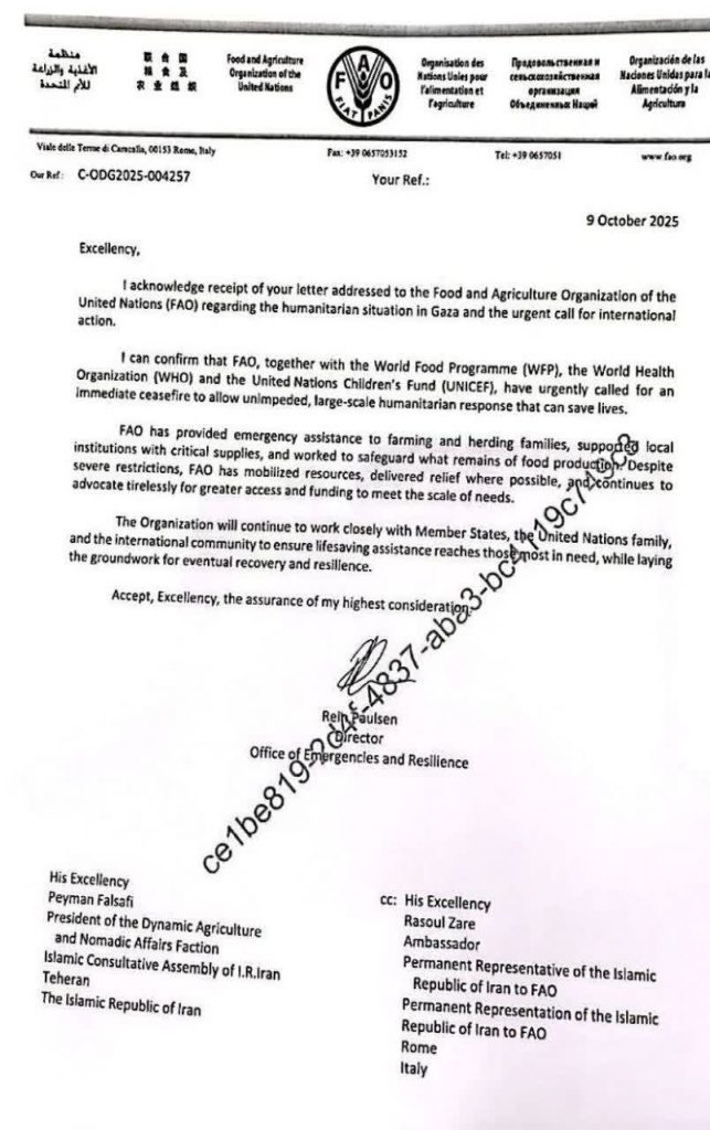 نامه جنابعالی خطاب به سازمان خواربار و کشاورزی ملل متحد (فائو) در خصوص وضعیت انسانی در غزه و درخواست فوری برای اقدام بین‌المللی را دریافت کردم.